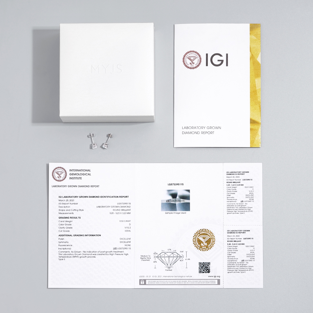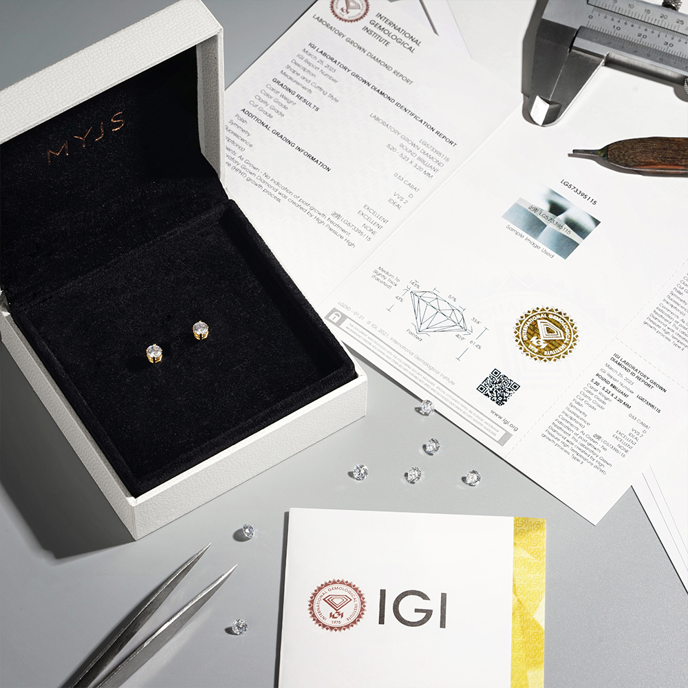 Every MYJS lab diamond is certified by the International Gemological Institute (IGI), the world's leading gemological body. Each diamond comes laser-inscribed with a unique code, verifiable on the official IGI website, accompanied by an IGI certificate. Lab-grown diamonds undergo grading just like natural diamonds, based on the four C's: Cut, Color, Carat, and Clarity.