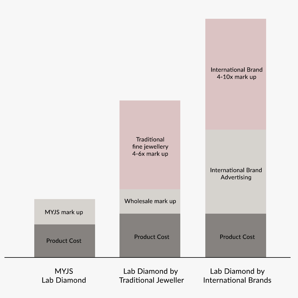 At MYJS, all our lab-grown IGI certified diamonds are priced at $800 AUD per carat (D-E Colour, VS1-VS2 Clarity, 3EX Cut), or $1000 for our Finest collection (D Colour, VVS1-VVS2 Clarity, 3EX Cut).